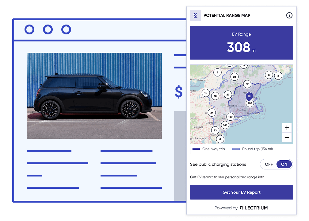 Improve the EV-buying experience by letting customers visualize personalized driving ranges and locate nearby fast-charging stations for every EV and PHEV in your inventory—all from your website.